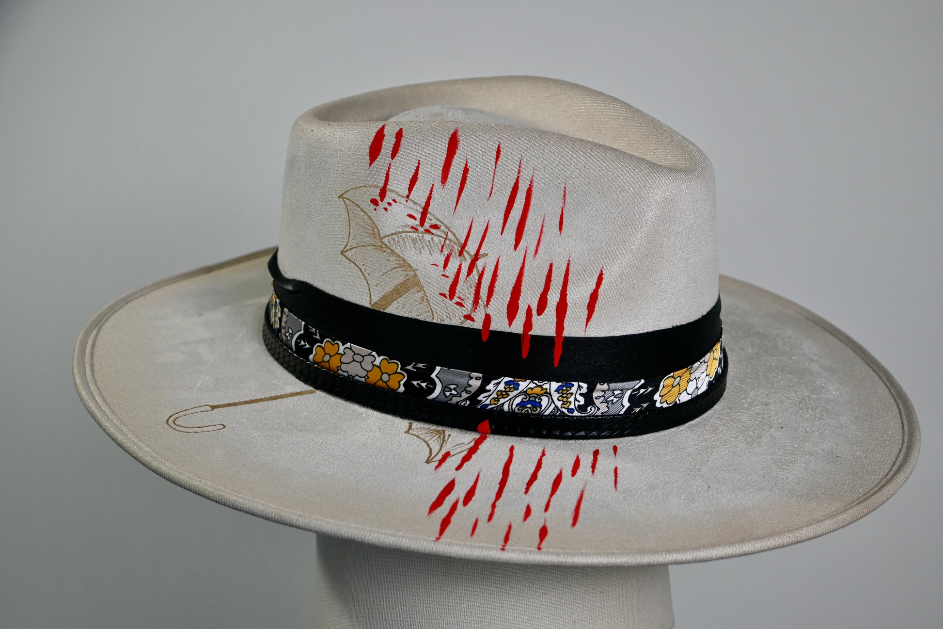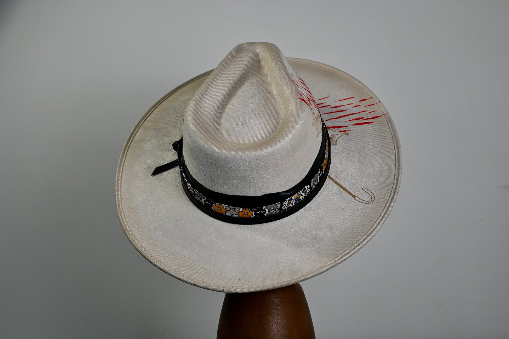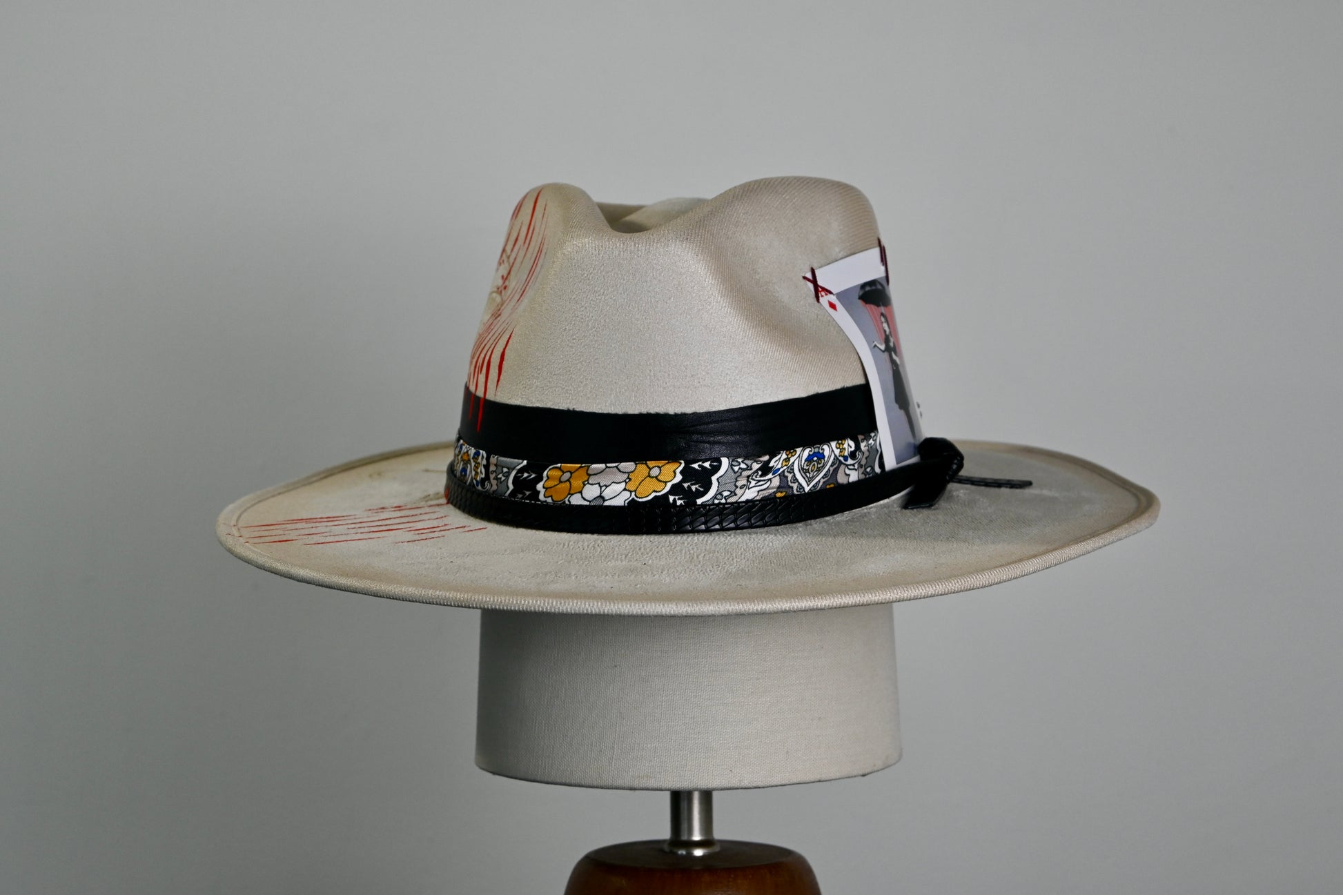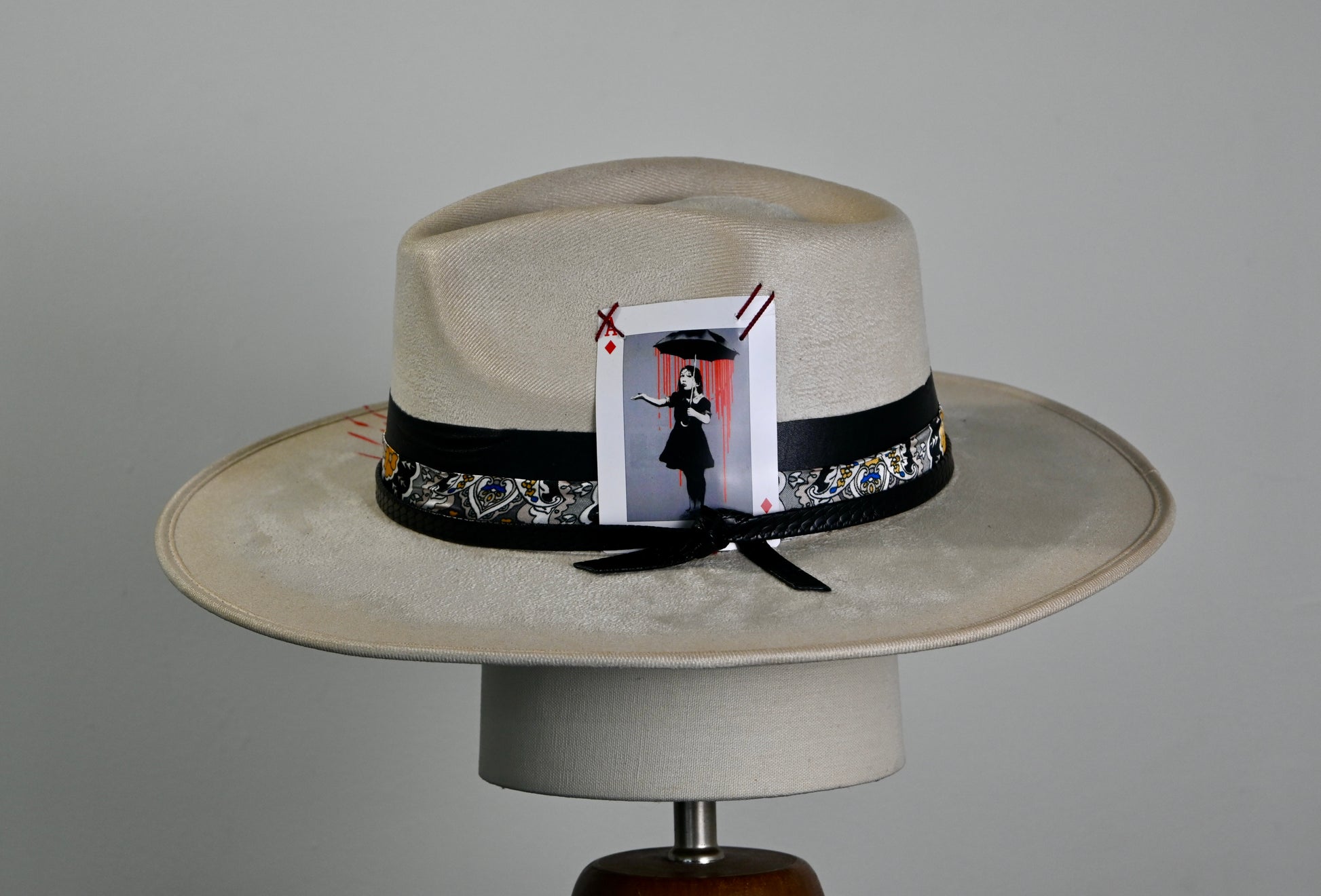 A layered band—crafted from grosgrain, patterned silk, and finished with a hand-tied leather cord—wraps the crown with distinctive texture. A custom playing card, showcasing street-art-inspired graphics, is tucked into the band and secured with contrast stitching for an unexpected artistic edge.
