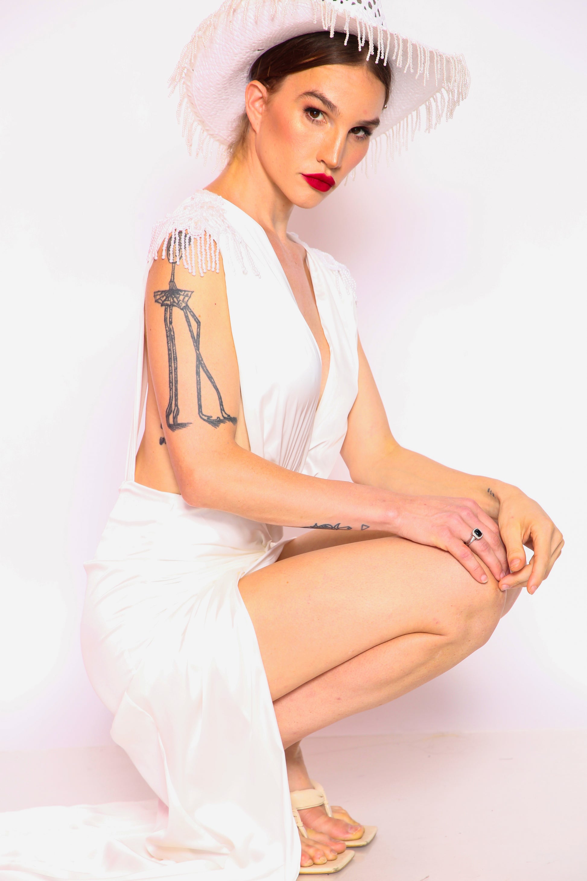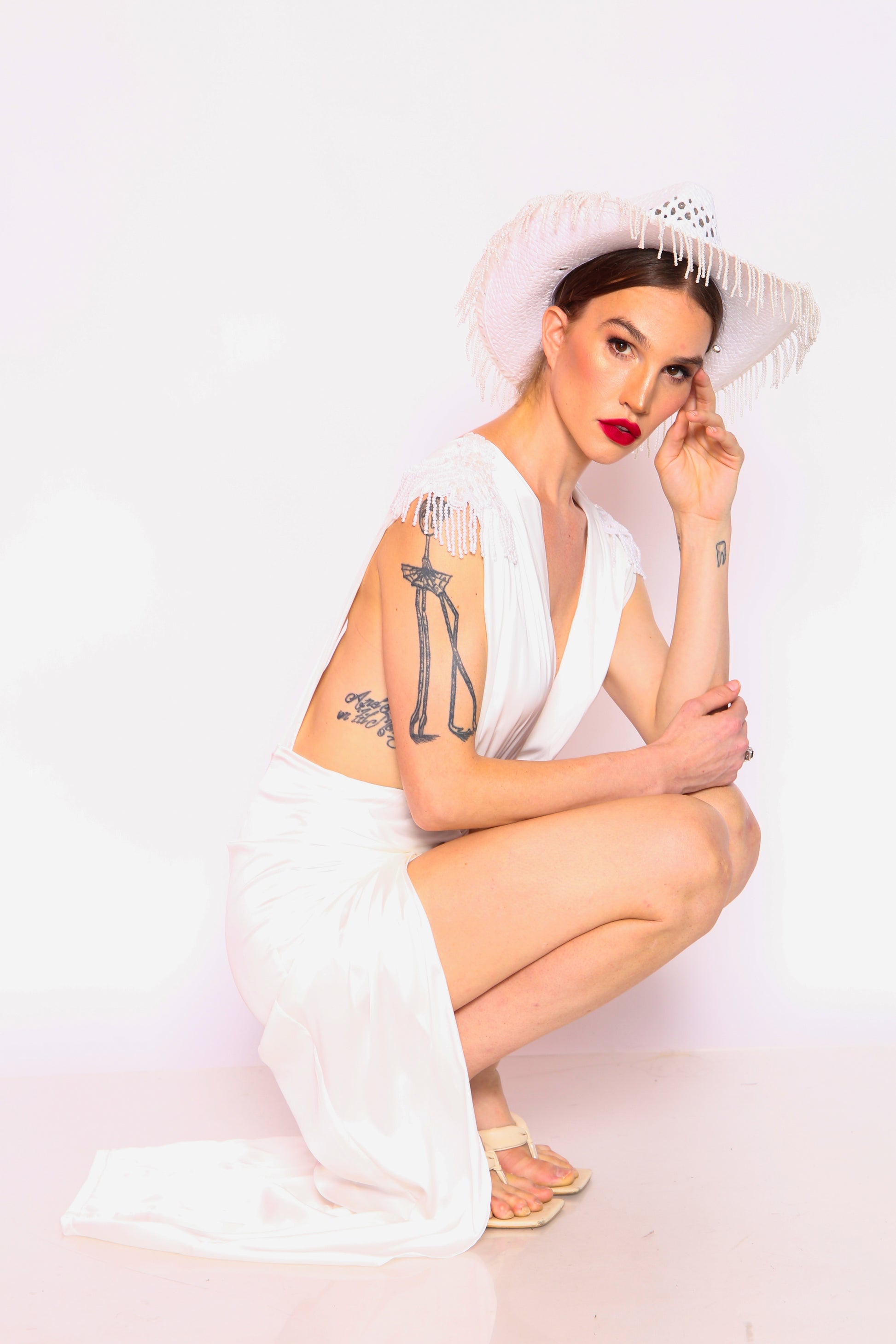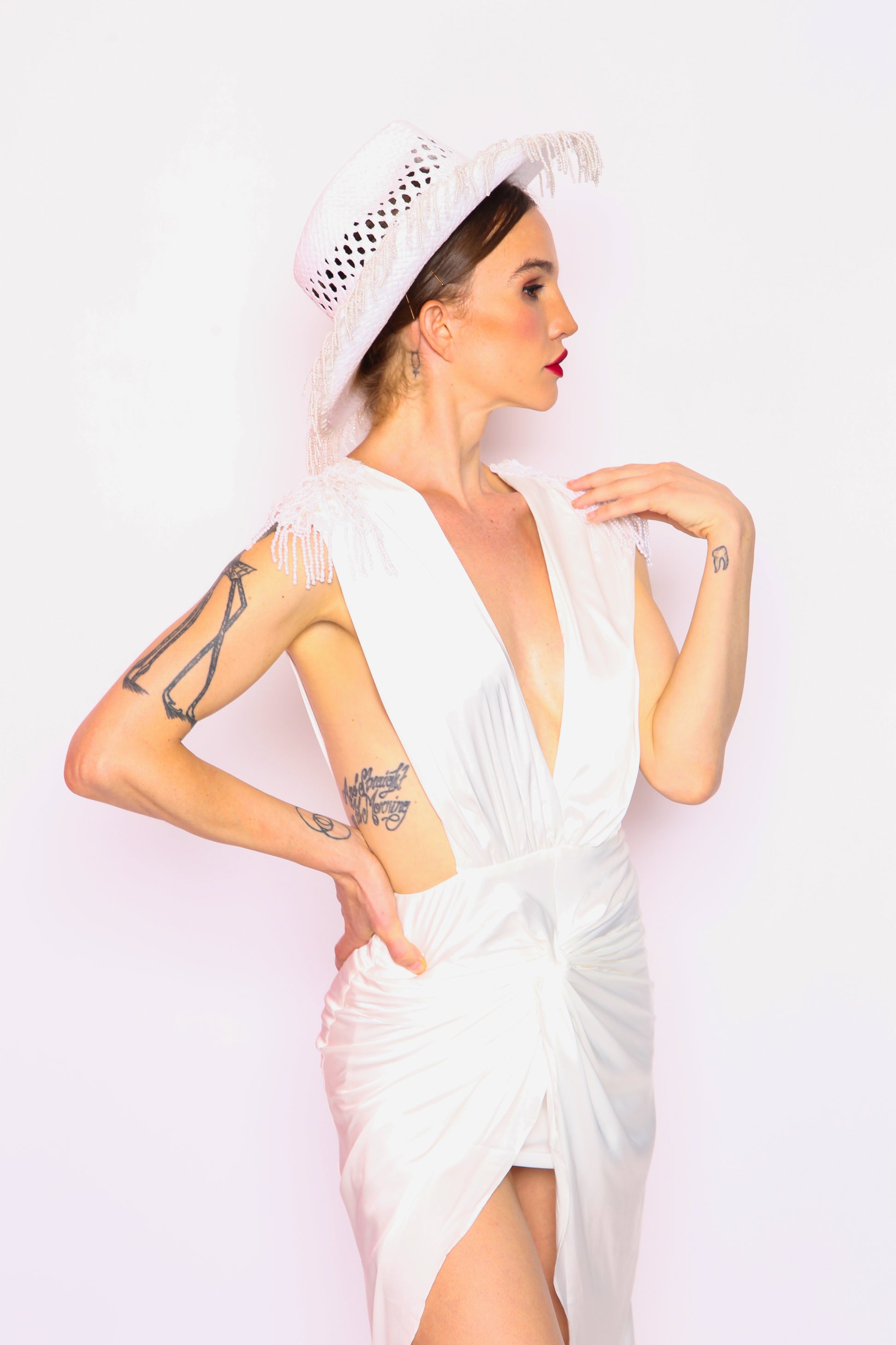 Beaded shoulder accents and a figure-hugging silhouette give this look an unapologetic energy, perfect for dance floors, desert festivals, or rule-breaking bridal moments. Paired with the statement pearl-fringed cowboy hat, this is a look that says: she came to slay.