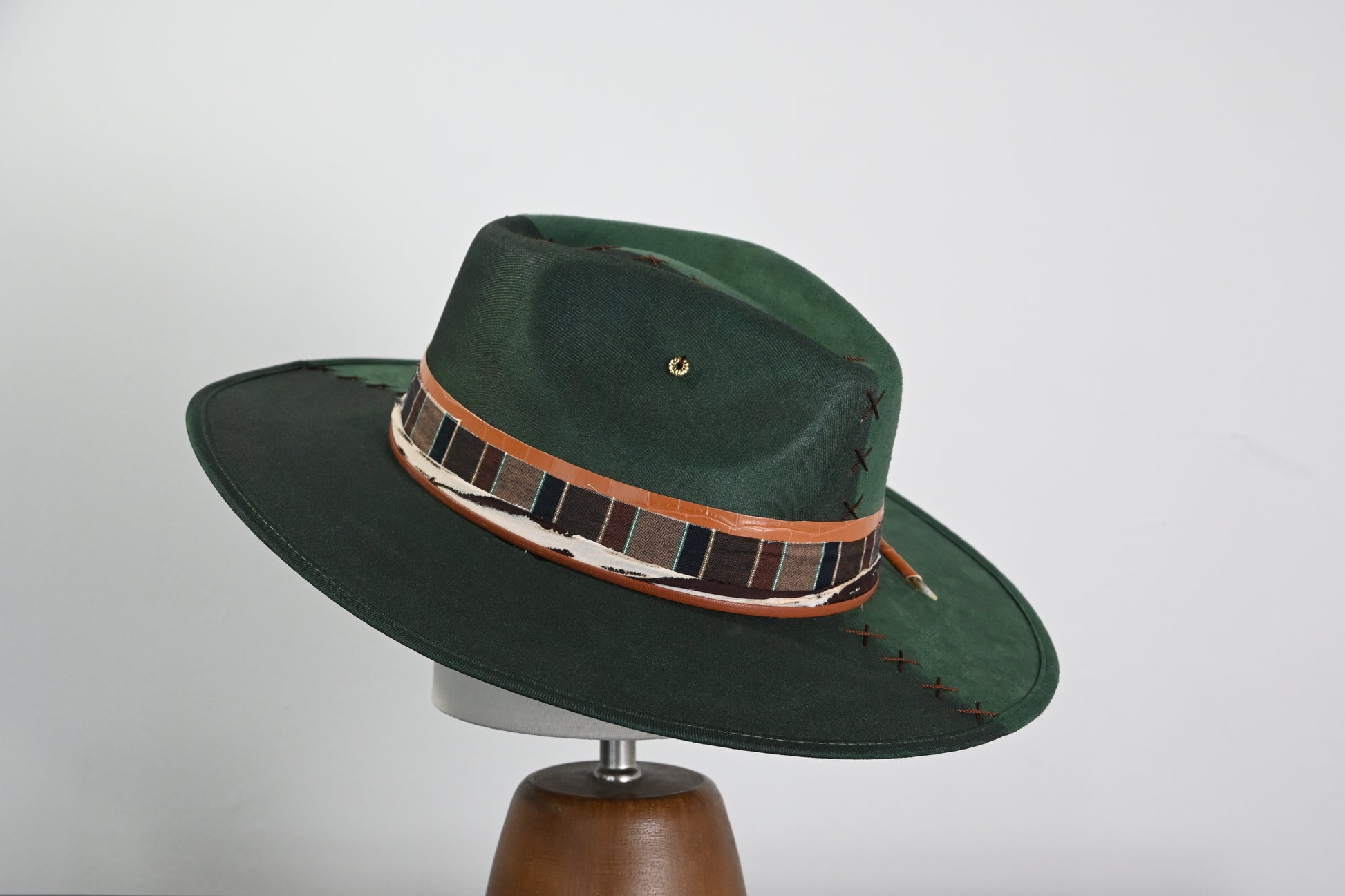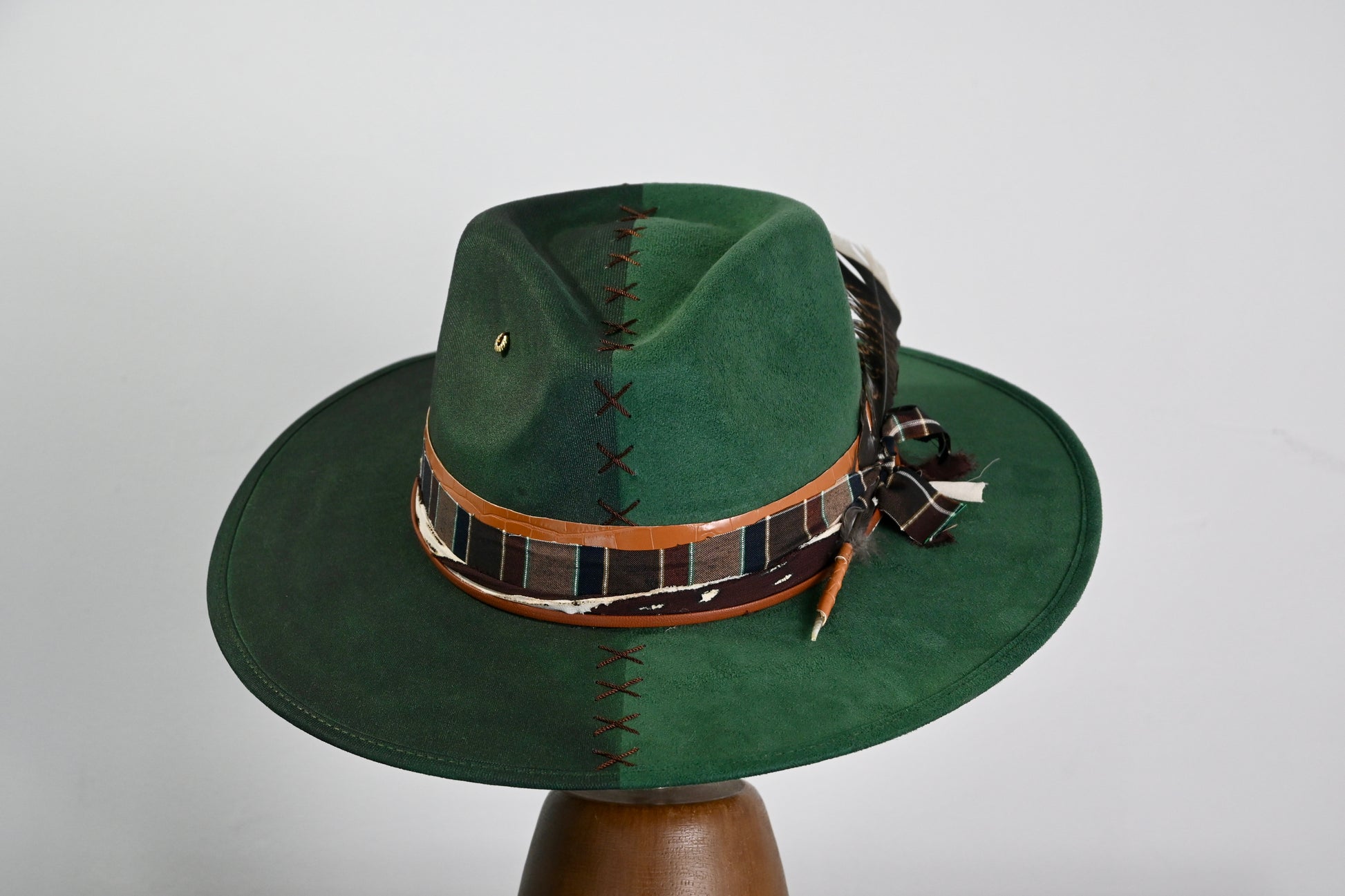 A statement in refined individuality, this fedora is meticulously handcrafted from the finest brushed suede, offering a velvety matte finish that exudes quiet luxury. The crown is defined by hand-laced cross-stitching in rich thread, running with tailored precision from brim to peak, a nod to bespoke saddle craftsmanship.