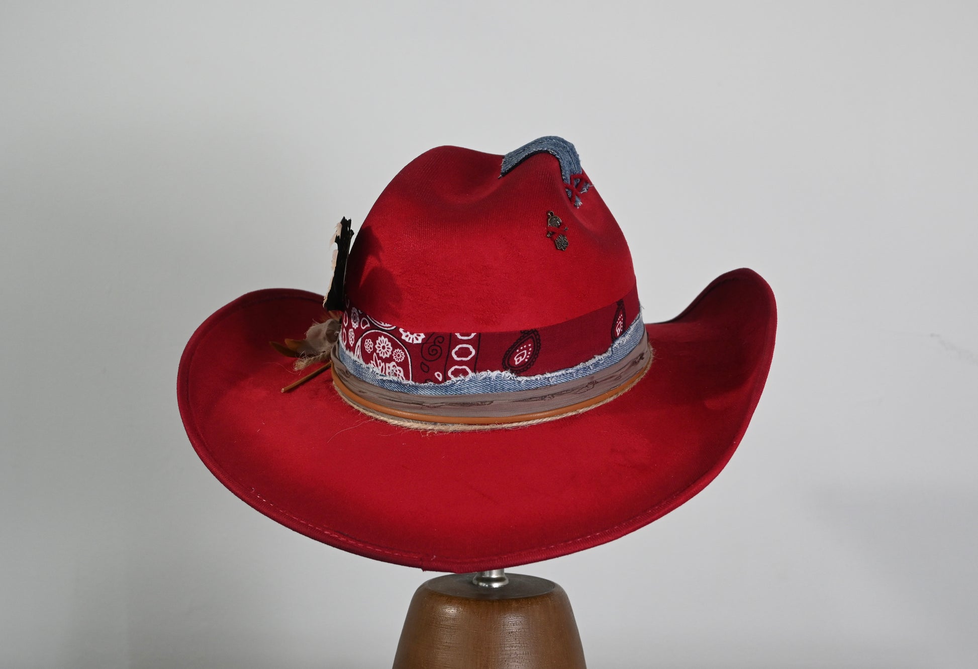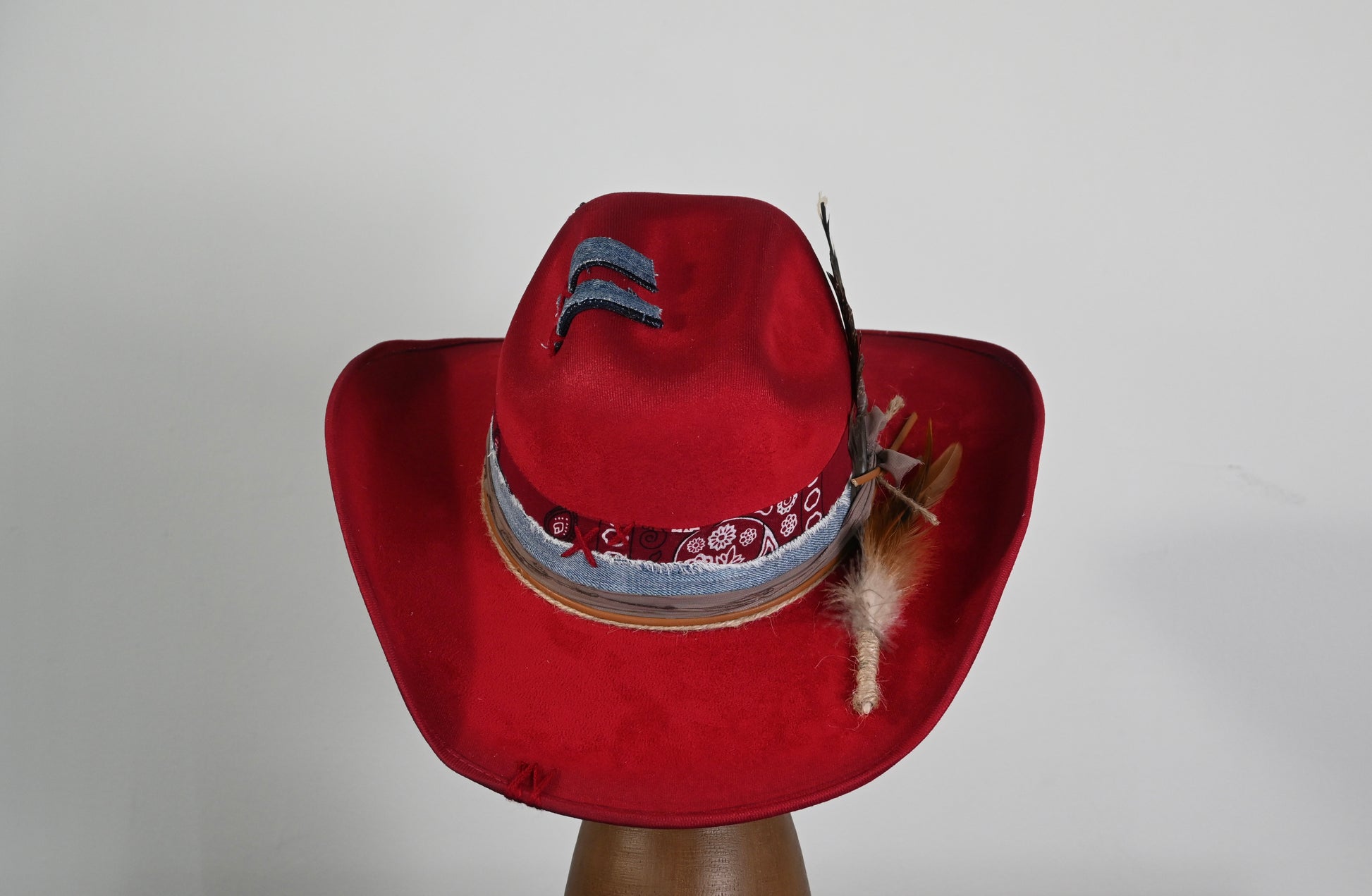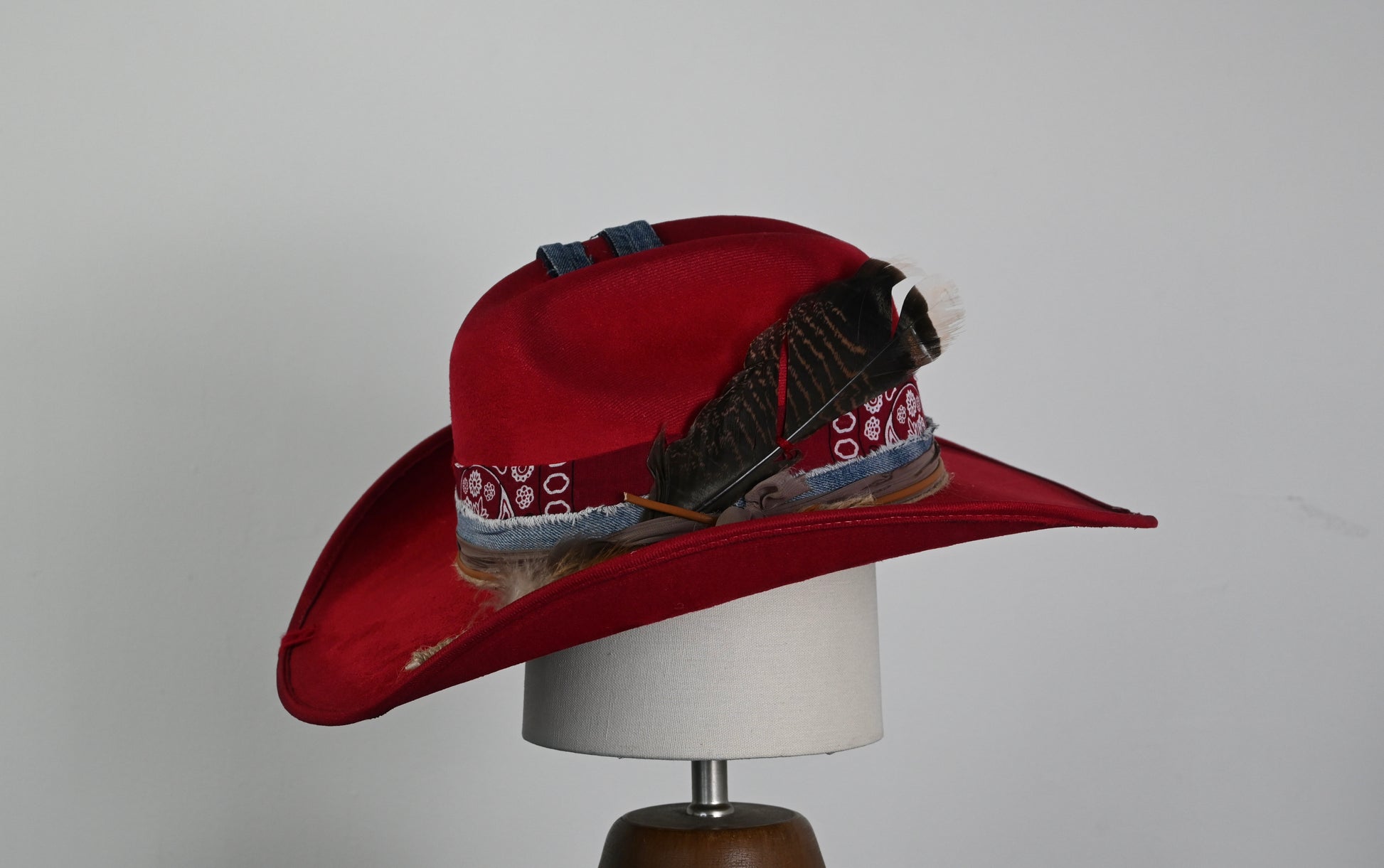 Around the base, a multi-layered hatband fuses the romance of classic Americana with artisanal finesse: a patterned textile ribbon, a raw-edge denim trim, and a smooth leather band anchor the look, while an arrangement of natural feathers adds movement and intrigue. The interplay of materials evokes a life well-traveled, rich with stories.