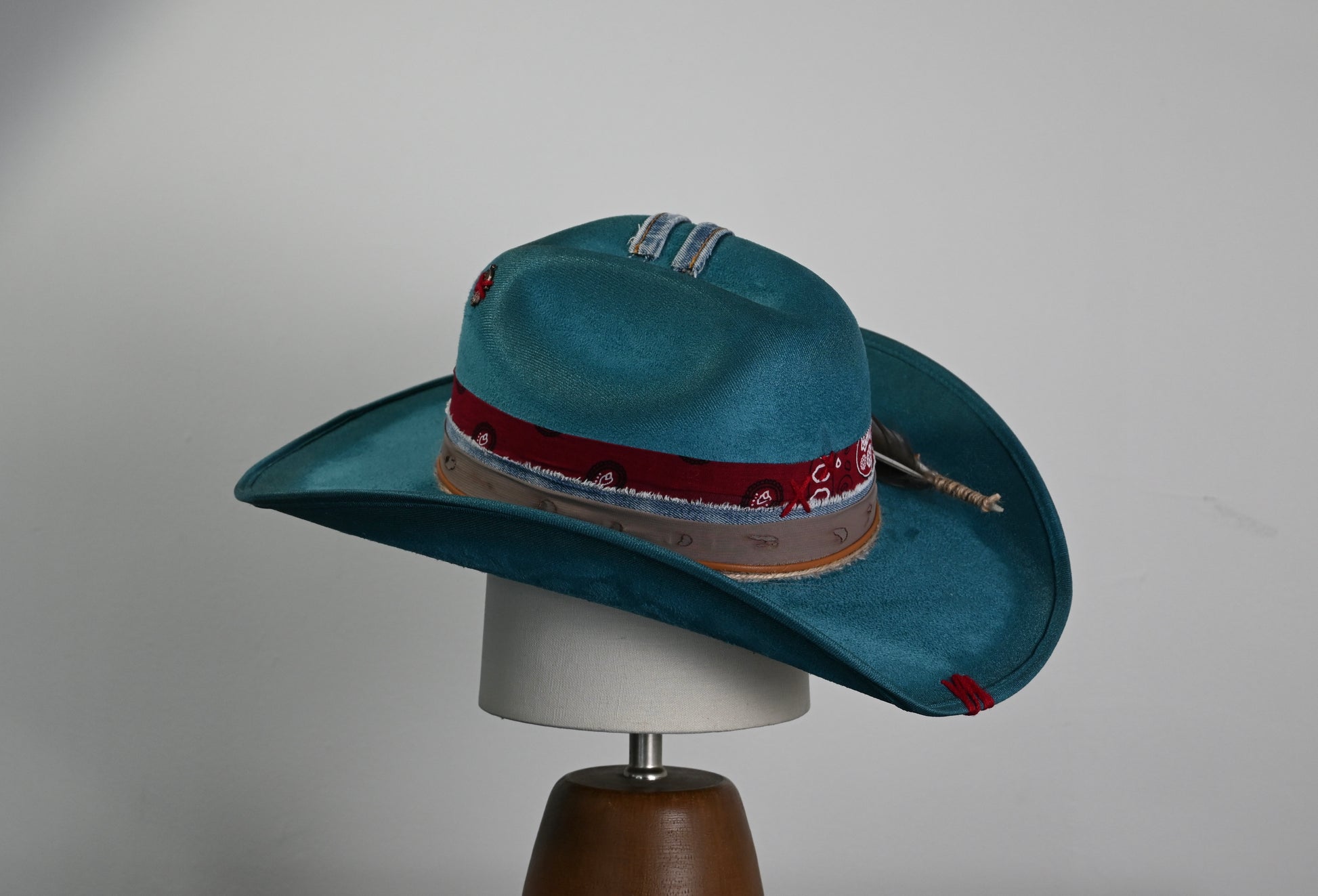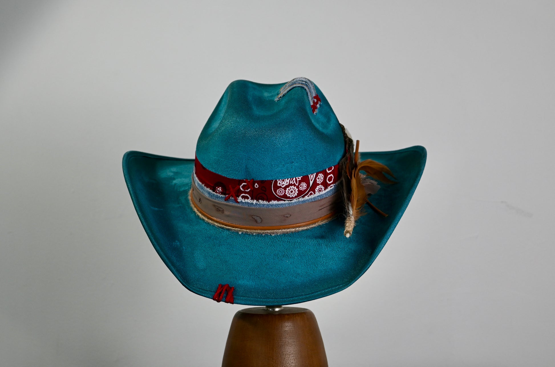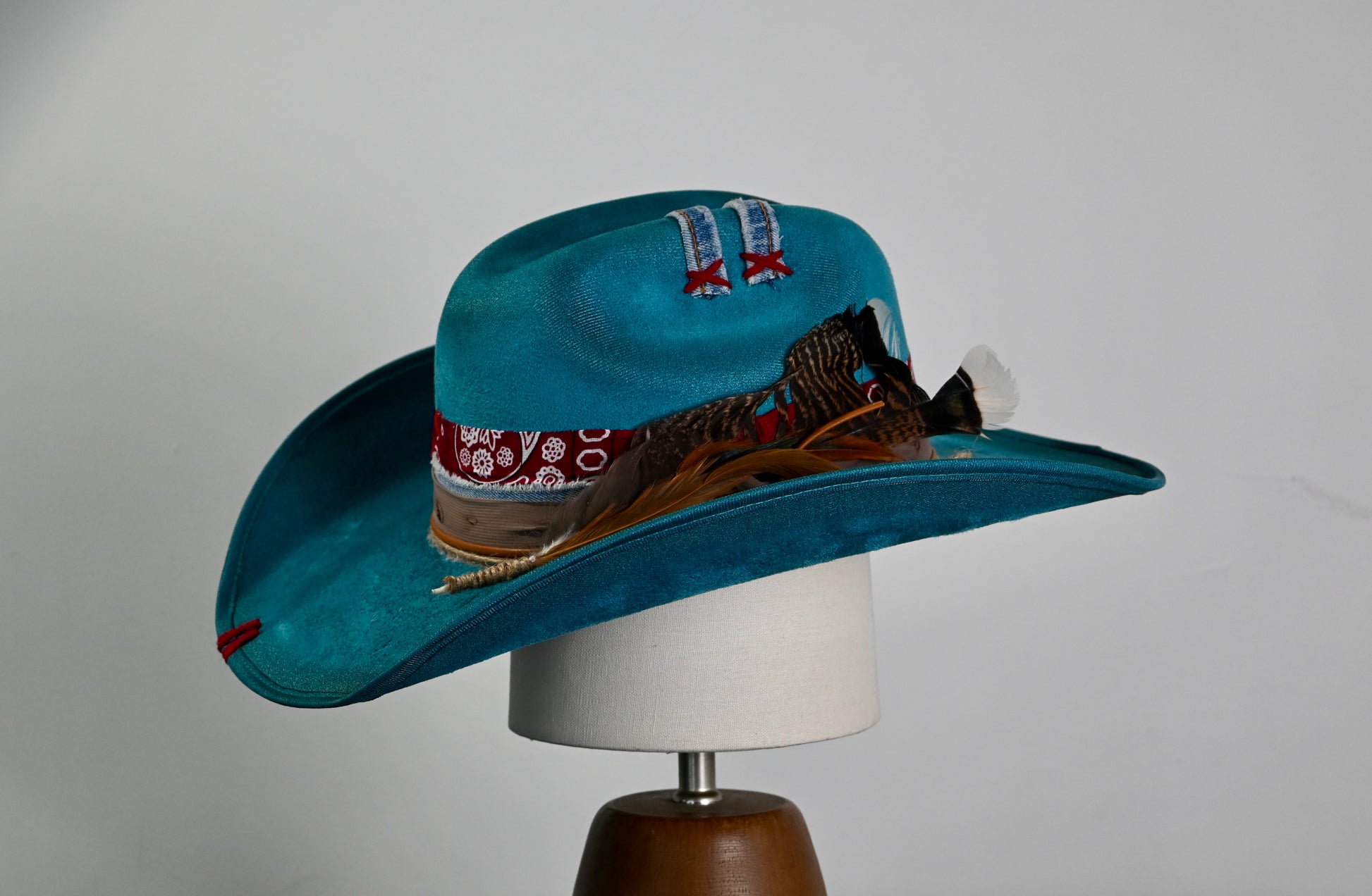 Around the base, a multi-layered hatband fuses the romance of classic Americana with artisanal finesse: a patterned textile ribbon, a raw-edge denim trim, and a smooth leather band anchor the look, while an arrangement of natural feathers adds movement and intrigue. The interplay of materials evokes a life well-traveled, rich with stories.